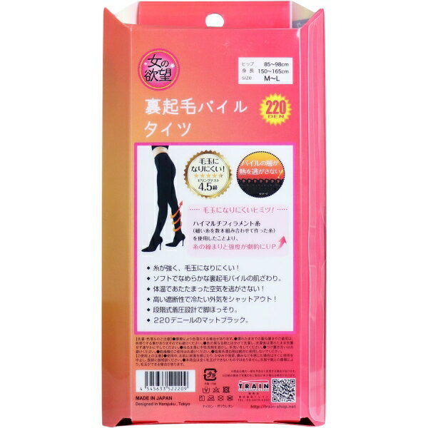 商品特徴一覧4545633-1、4545633522209、通信販売、通販、販売、買う、購入、お店、売っている、ショッピング【女の欲望 裏起毛パイルタイツ 220デニール ブラック M-Lサイズ】広告文責(有)イースクエアTEL:0120-532-772株式会社トレイン個装サイズ:115X230X50mm個装重量:約146g内容量:1枚入ケースサイズ:59.6X53X25.6cmケース重量:約8.85kg製造国:日本【発売元:トレイン】【素材】ナイロン・ポリウレタン【カラー】ブラック【M-Lサイズ】身長:150-165cmヒップ:85-98cm【着圧値(hPa)】足首:15hpaふくらはぎ:10hpa太もも:7hpa【洗濯・色落ちのご注意】・摩擦により色落ちする場合があります。